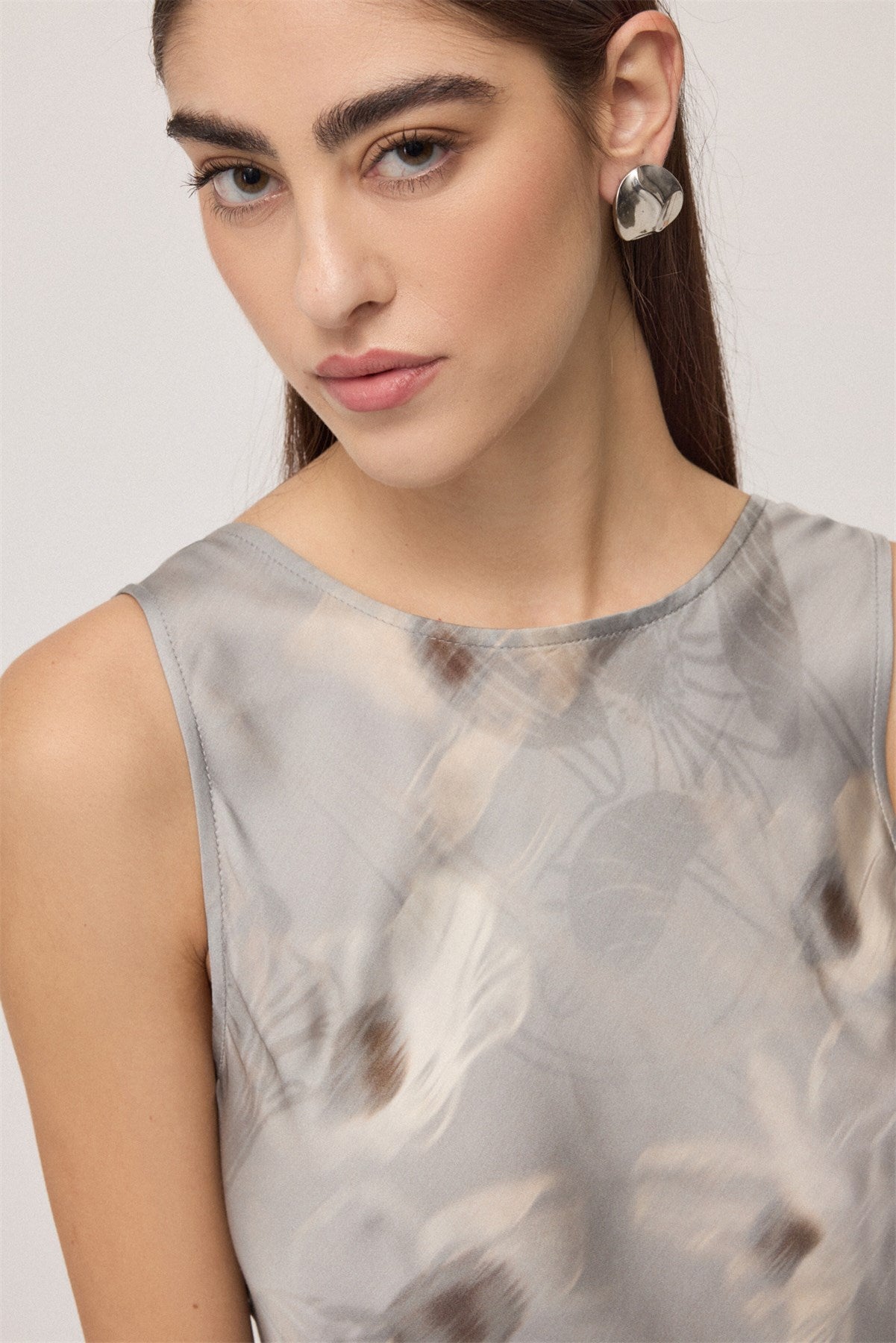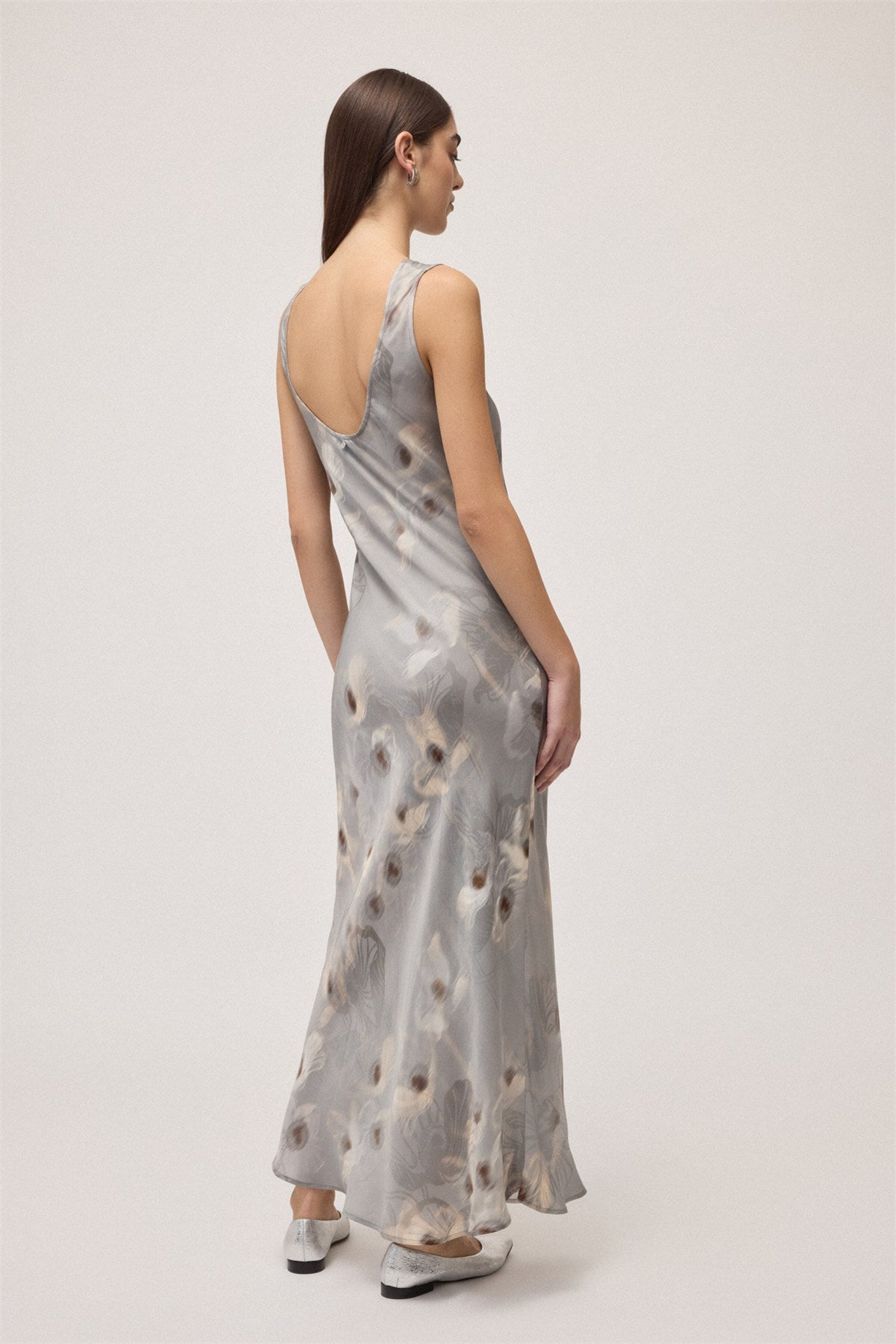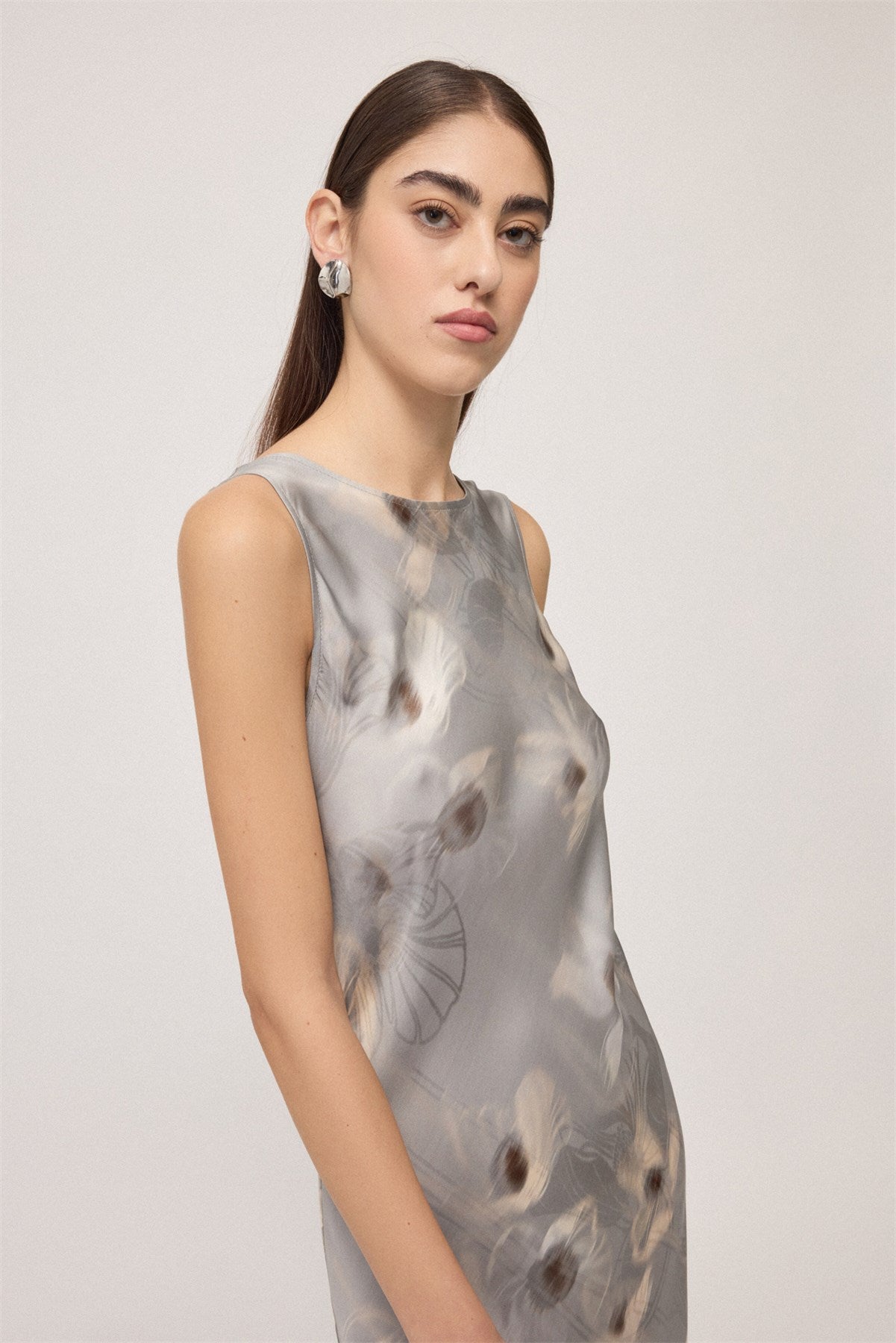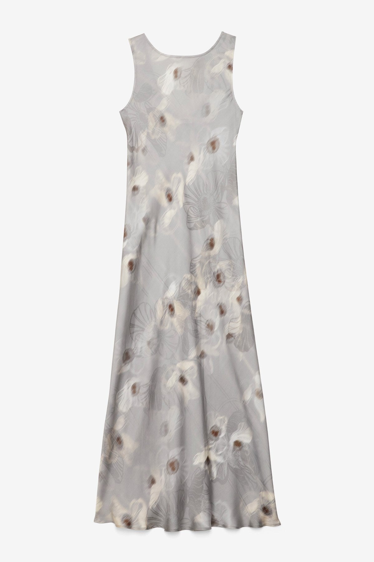 Abito in viscosa con applicazione stampa floerale in variante argento