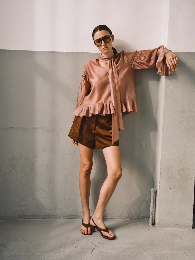 Blusa firenze in enghlisg rose con chiusura a nodo sul collo e rouge