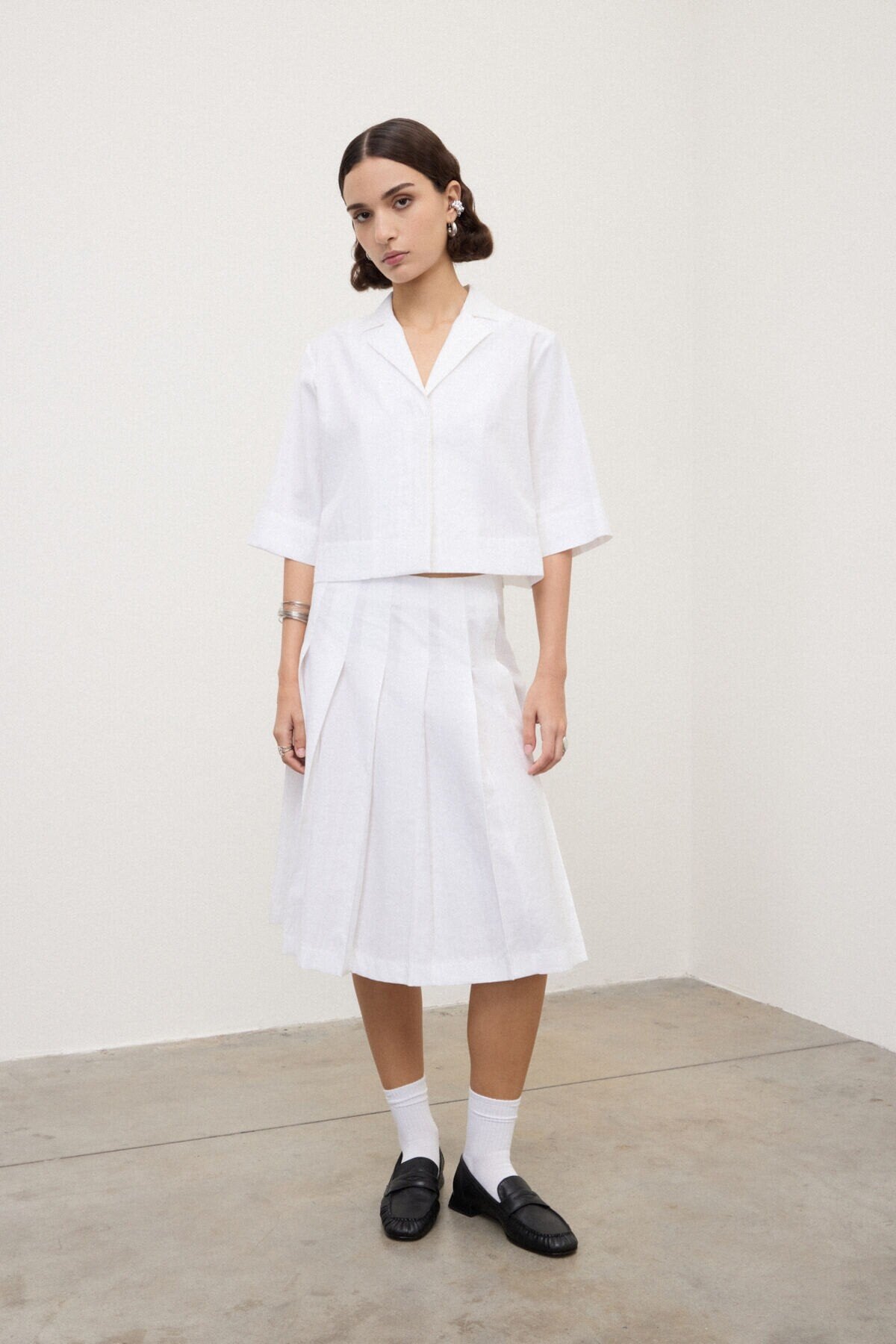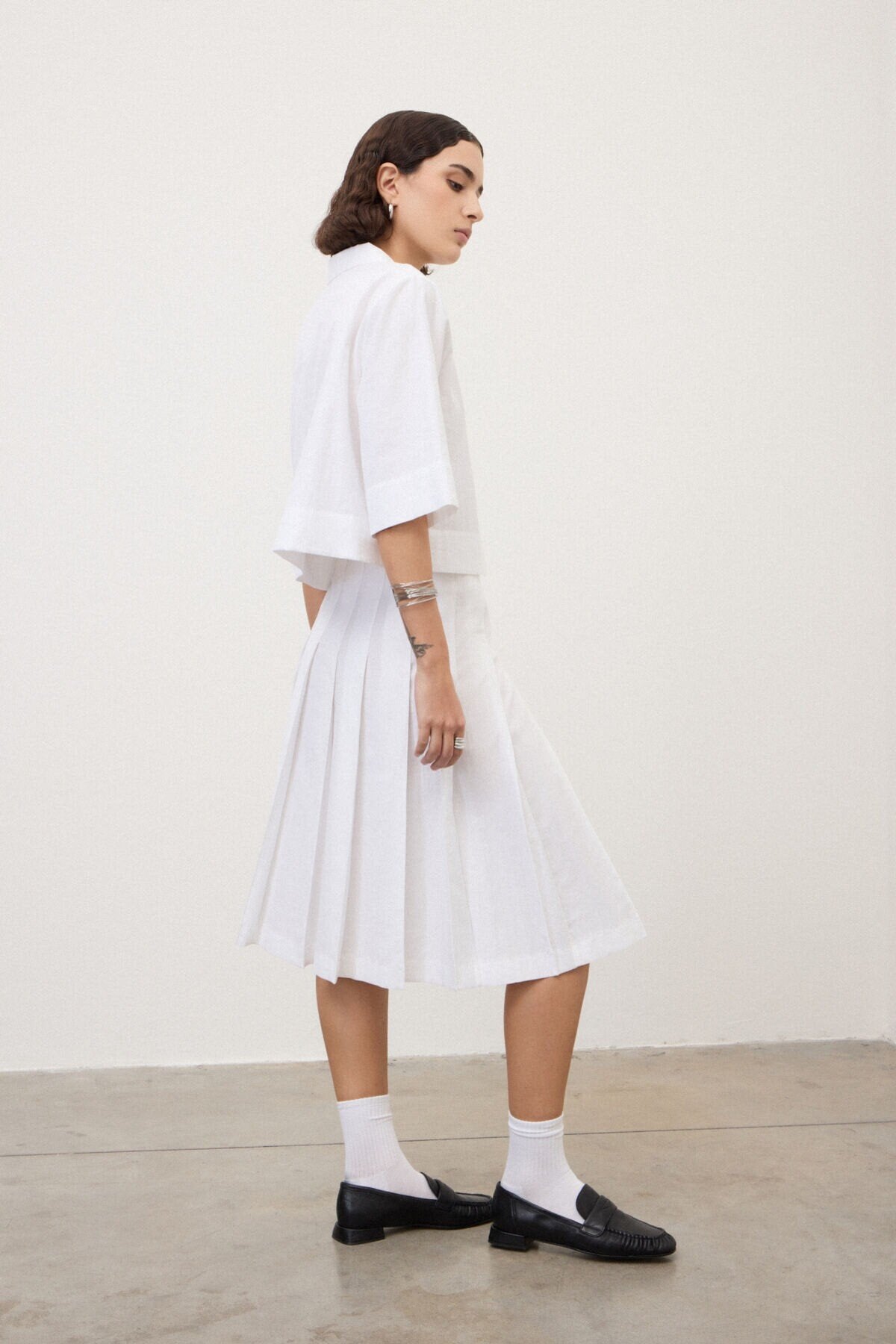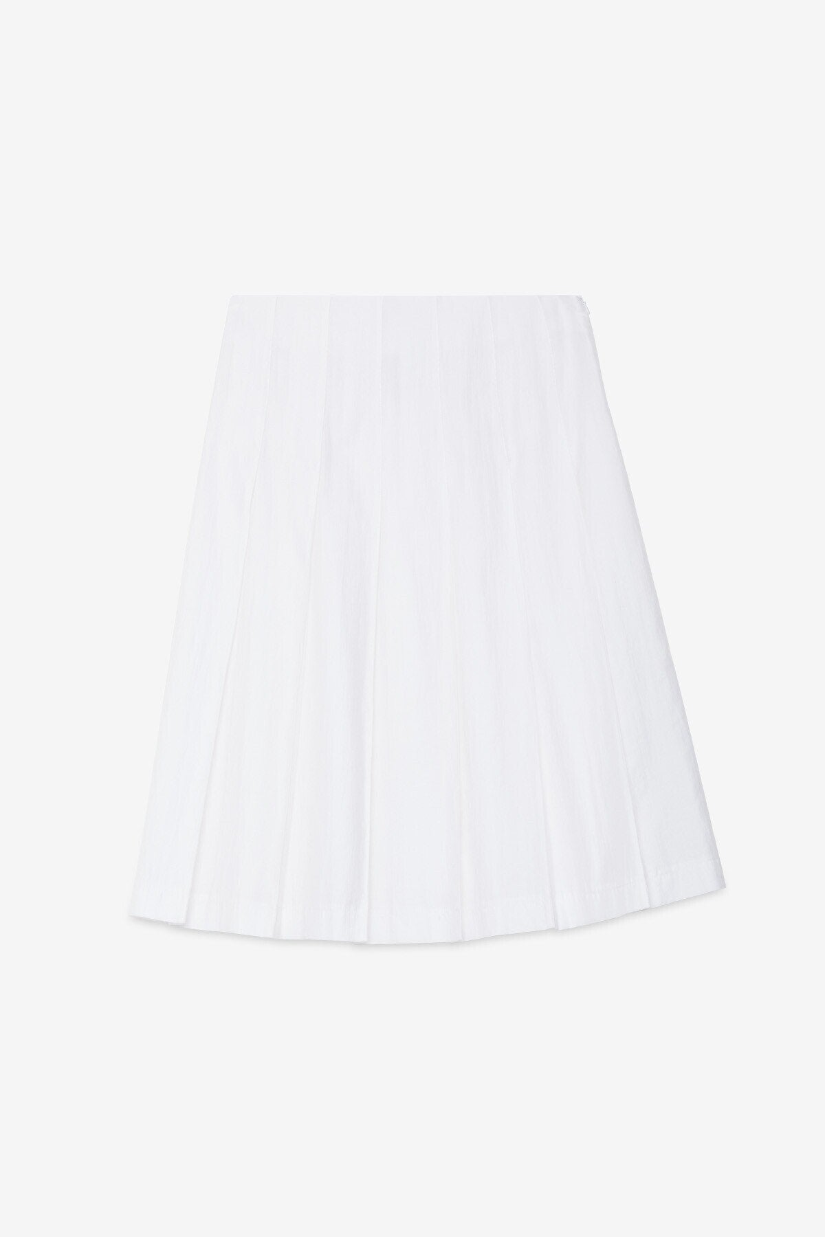 Gonna midi a pieghe realizzata in tessuto misto cotone con effetto grinzato, morbido e materico. La costruzione ampia valorizza il movimento, per un look casual e fresco, perfetto nella stagione primaverile ed estiva.