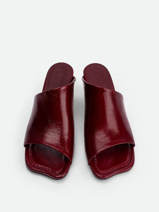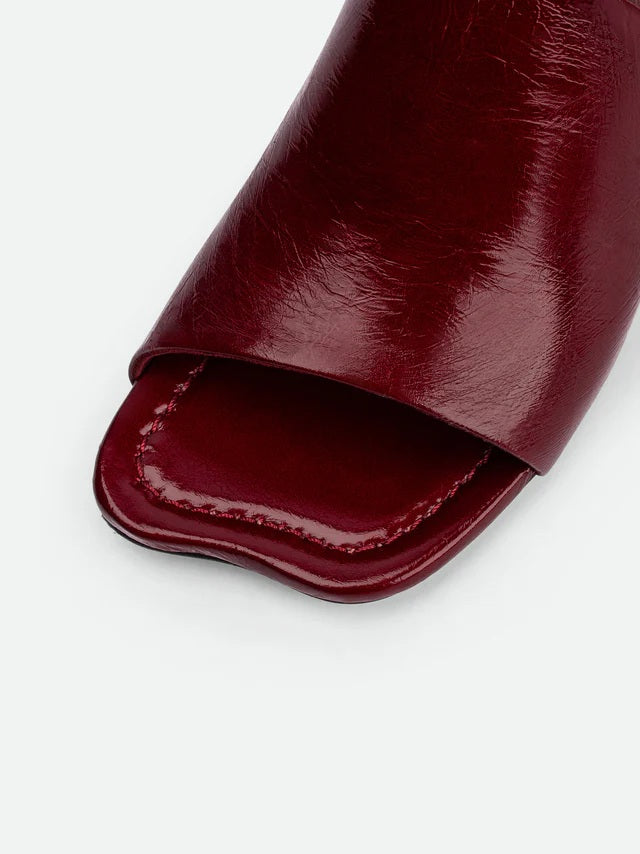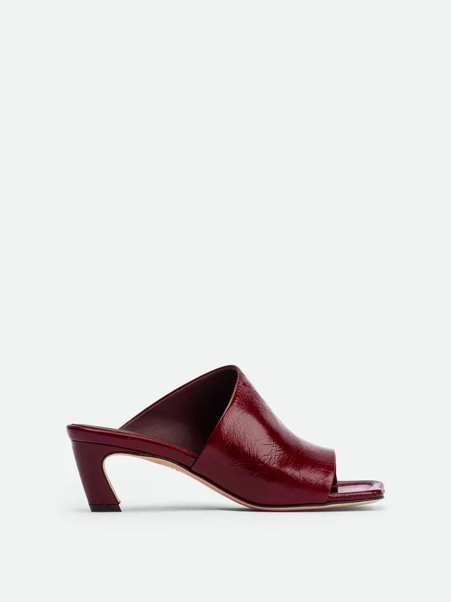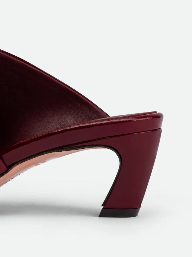 Le mules Mavis, realizzate in morbida pelle verniciata stropicciata color ciliegia scuro, presentano una punta dalla forma unica, una tomaia asimmetrica e un elegante tacco scolpito di 55 mm. Una scarpa ideale per impreziosire sia i look casual che quelli da sera.