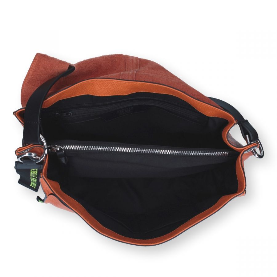 L'intero è foderato e diviso in due scomparti molti ampi divisi da una tasca con zip. La borsa davanti ha due tasche porta oggetti.