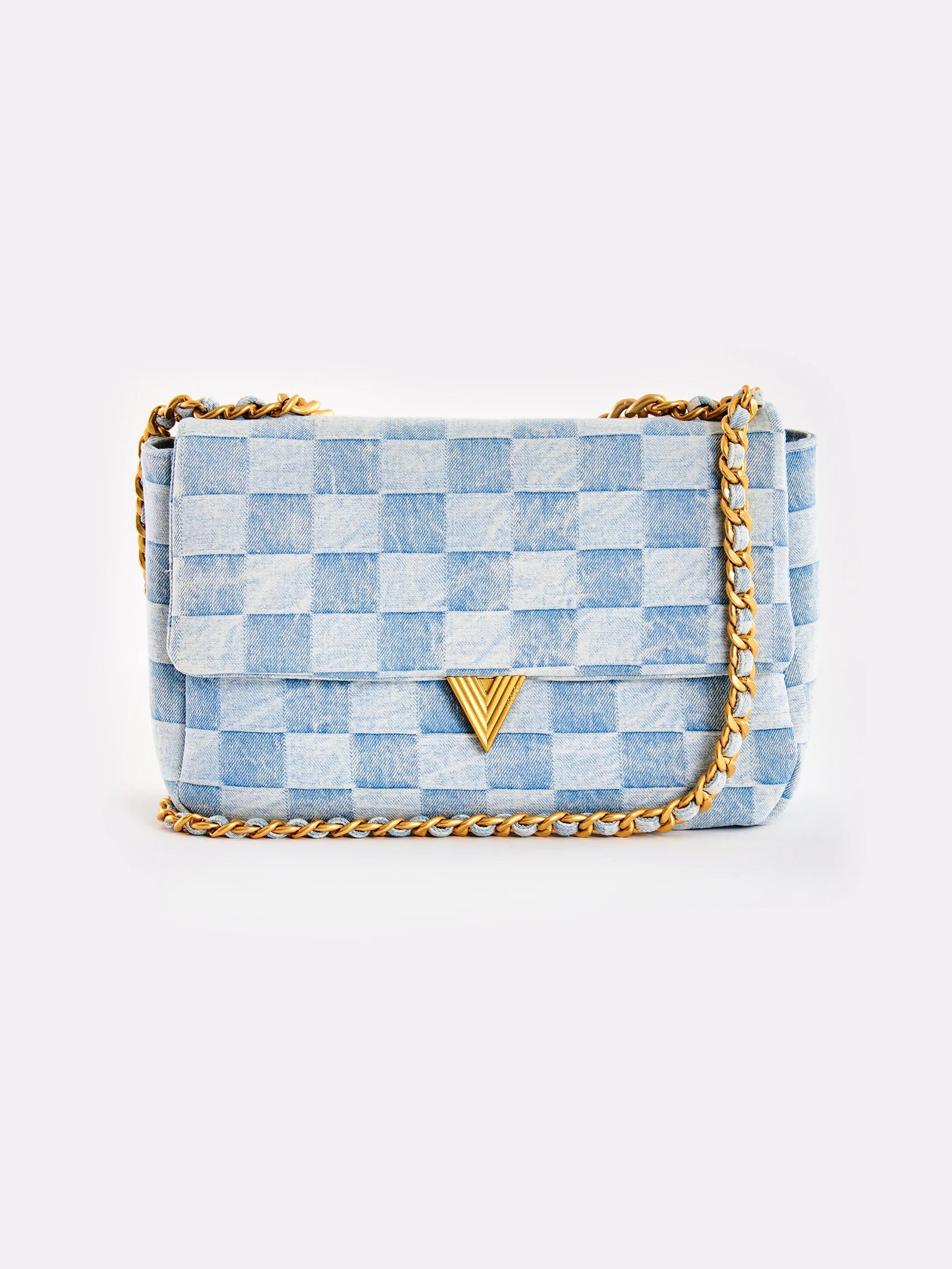 Borsa Dama a tracolla in denim. Chiusura a pattina con bottone a pressione con calamita. Dettaglio fibbia V metal plate Vicolo. Tracolla con catena fissa con tessuto denim passante. Manico fisso con catena groumetta. La borsa può essere indossata sia come borsa a spalla che come borsa a mano. Dettaglio finiture color oro. Tasca interna con cerniera e taschina piatta. Tessuto denim a scacchi.