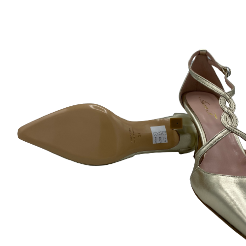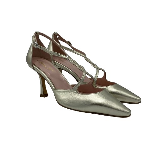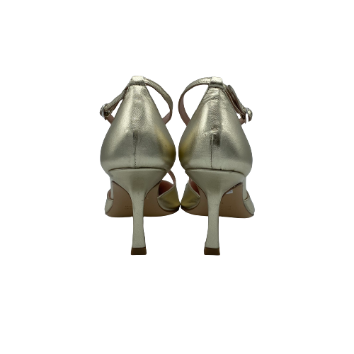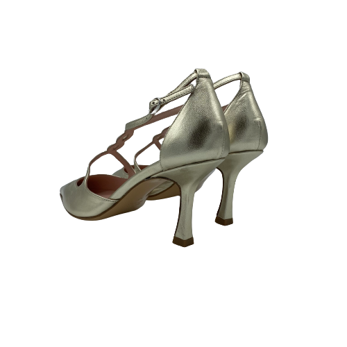 Décolleté Anna F. a punta in pelle laminata color platino con cinturino a T