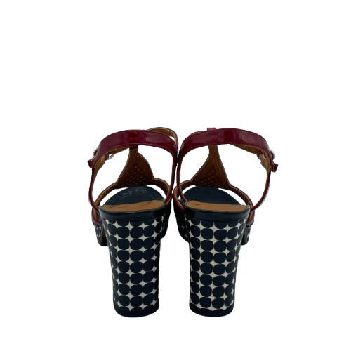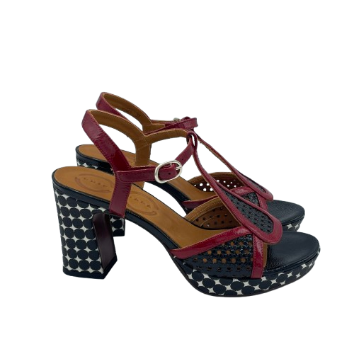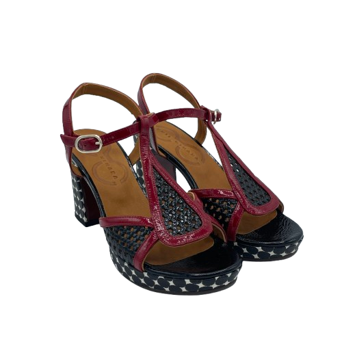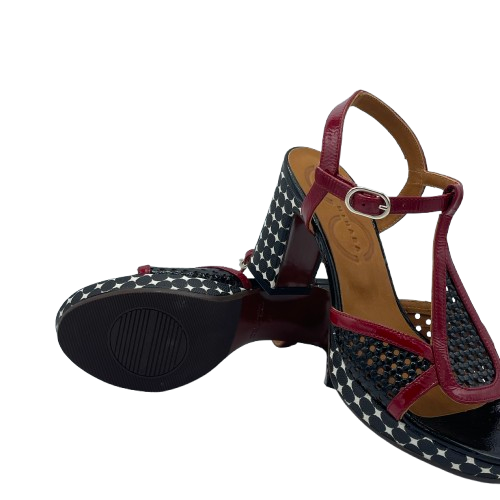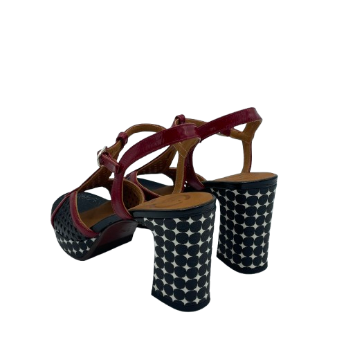 Sandalo Chie Mihara in pelle laserata nera, pelle con effetto verniciato rossa e pelle stampata bianca e nera