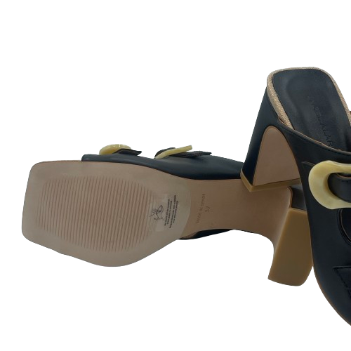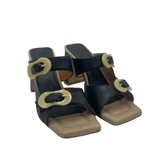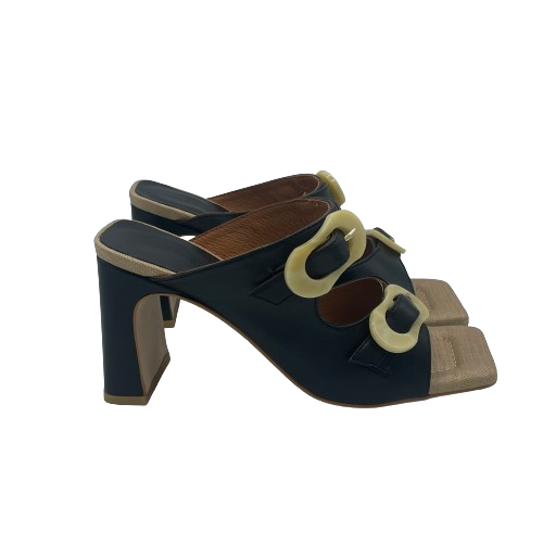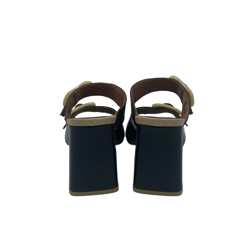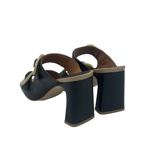Ciabatta con tacco Angel Alarcon in pelle nera con doppia fascia e fibbie in plastica beige