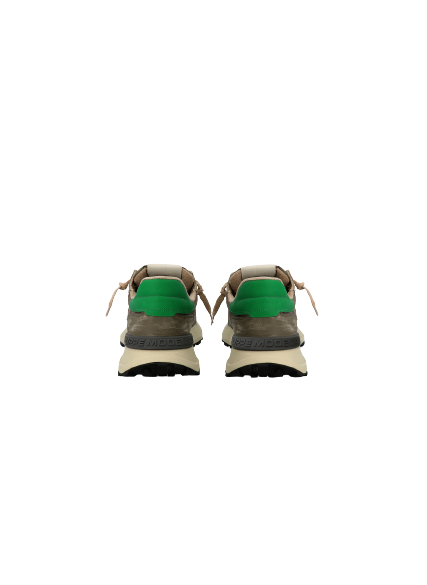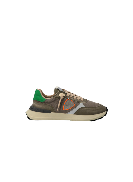 Ispirata alle corse vintage, Antibes reiventa i canoni della scarpa da running e rievoca lo stile fresco e naturale della Costa Azzurra con un'attitude giovane. Il modello uomo in nylon color verde militare con dettagli in suede e pelle eco-friendly grigi e arancioni a contrasto e talloncino verde, ha una costruzione Strobel ad assicurarne massima flessibilità e confort. La suola sabbia è super leggera in Eva con un altezza di 3,5 com. Mentre la soletta interna è Ortholite, per una camminata morbida, con fodera traspirante.