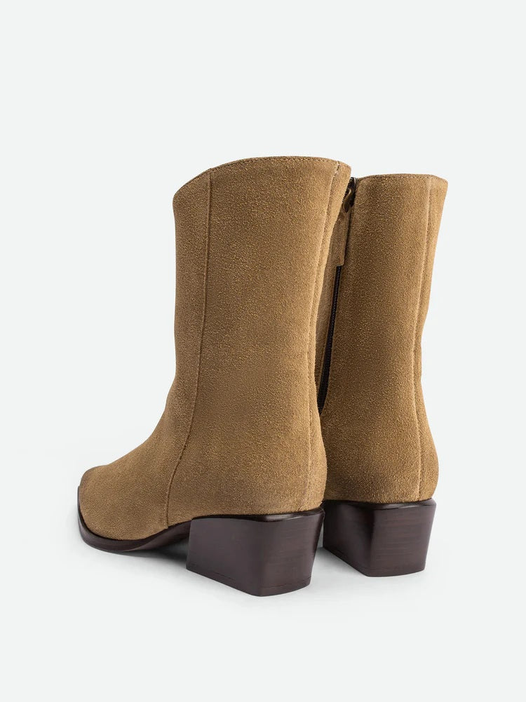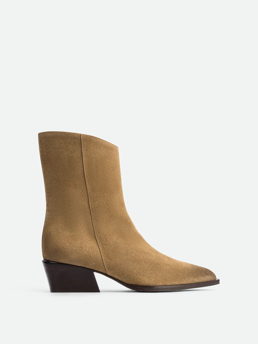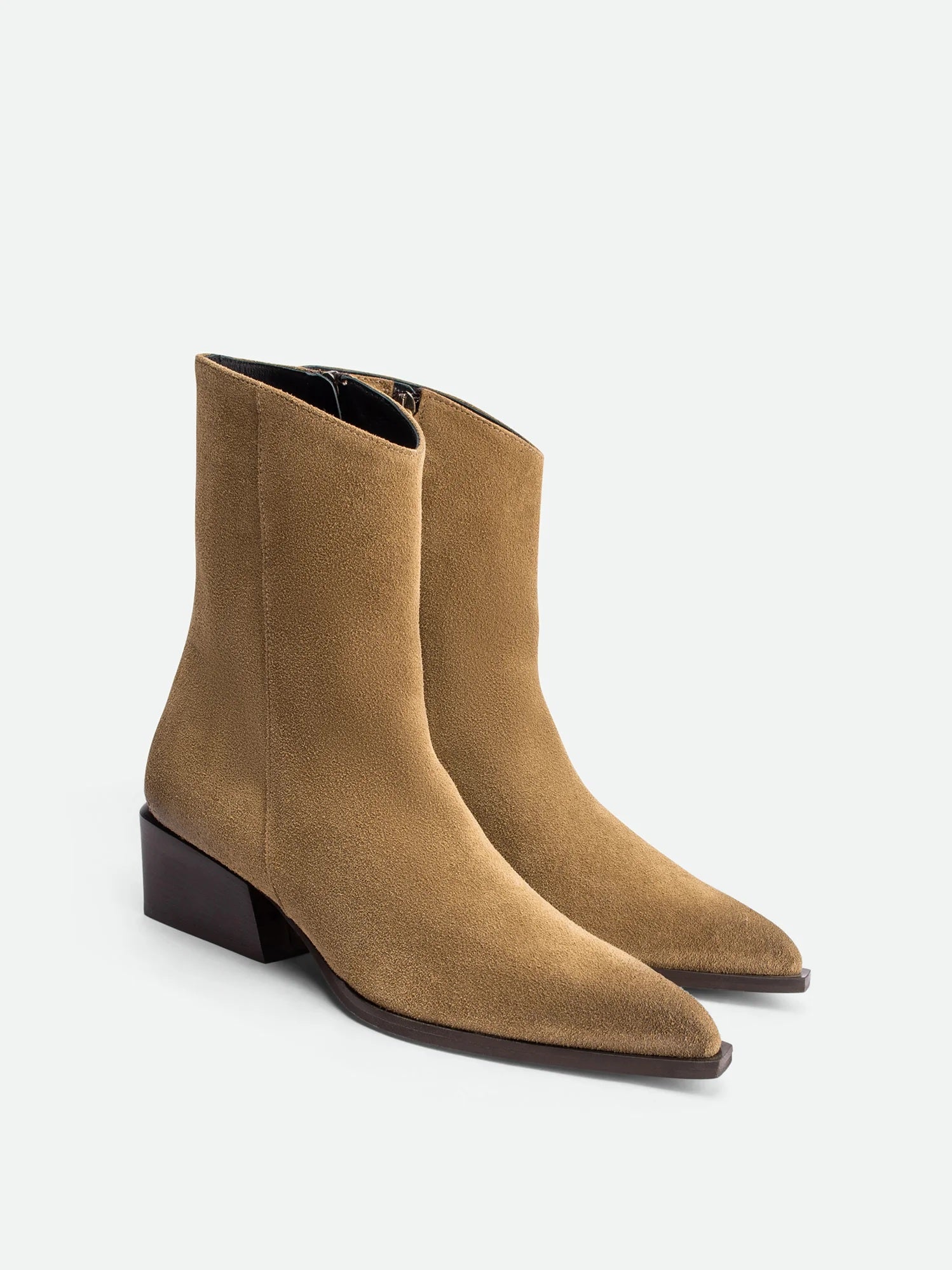 Realizzati artigianalmente in Italia in morbida pelle scamosciata beige, questi stivaletti conferiscono alla silhouette western un tocco moderno e urbano. La punta affusolata aggiunge eleganza e slancia il piede, mentre la tomaia pulita con cuciture minime ne esalta l'eleganza. Il tacco a blocco angolato di media altezza offre un comodo sostegno, mentre la cerniera laterale completa ne facilita l'indossabilità. Rifiniti con fodera in pelle e resistente suola in gomma.