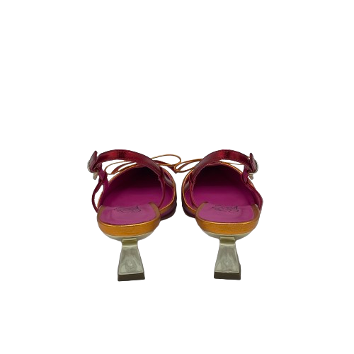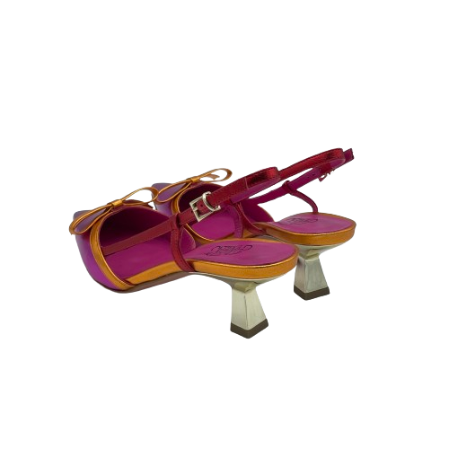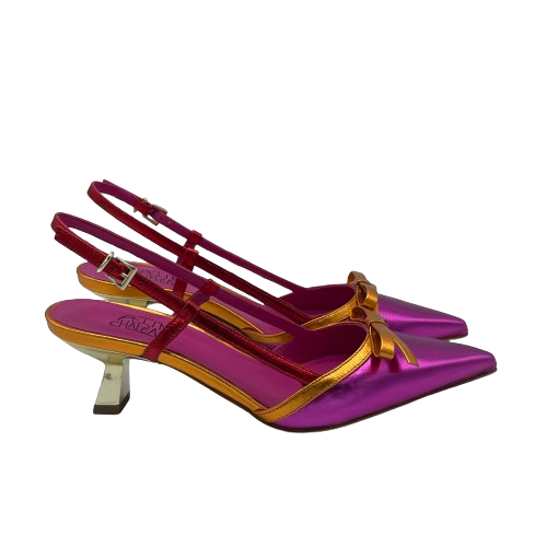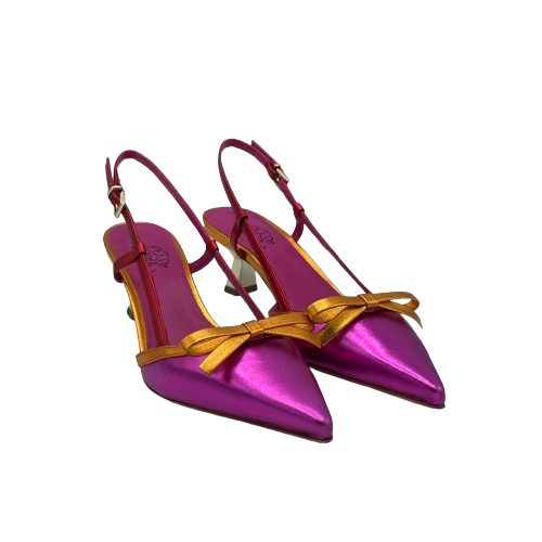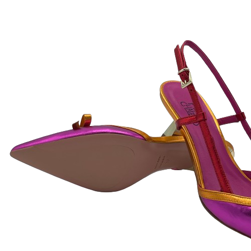 Slingback Petit Chapeau a punta in pelle laminata fuxia con dettagli in pelle laminata arancio