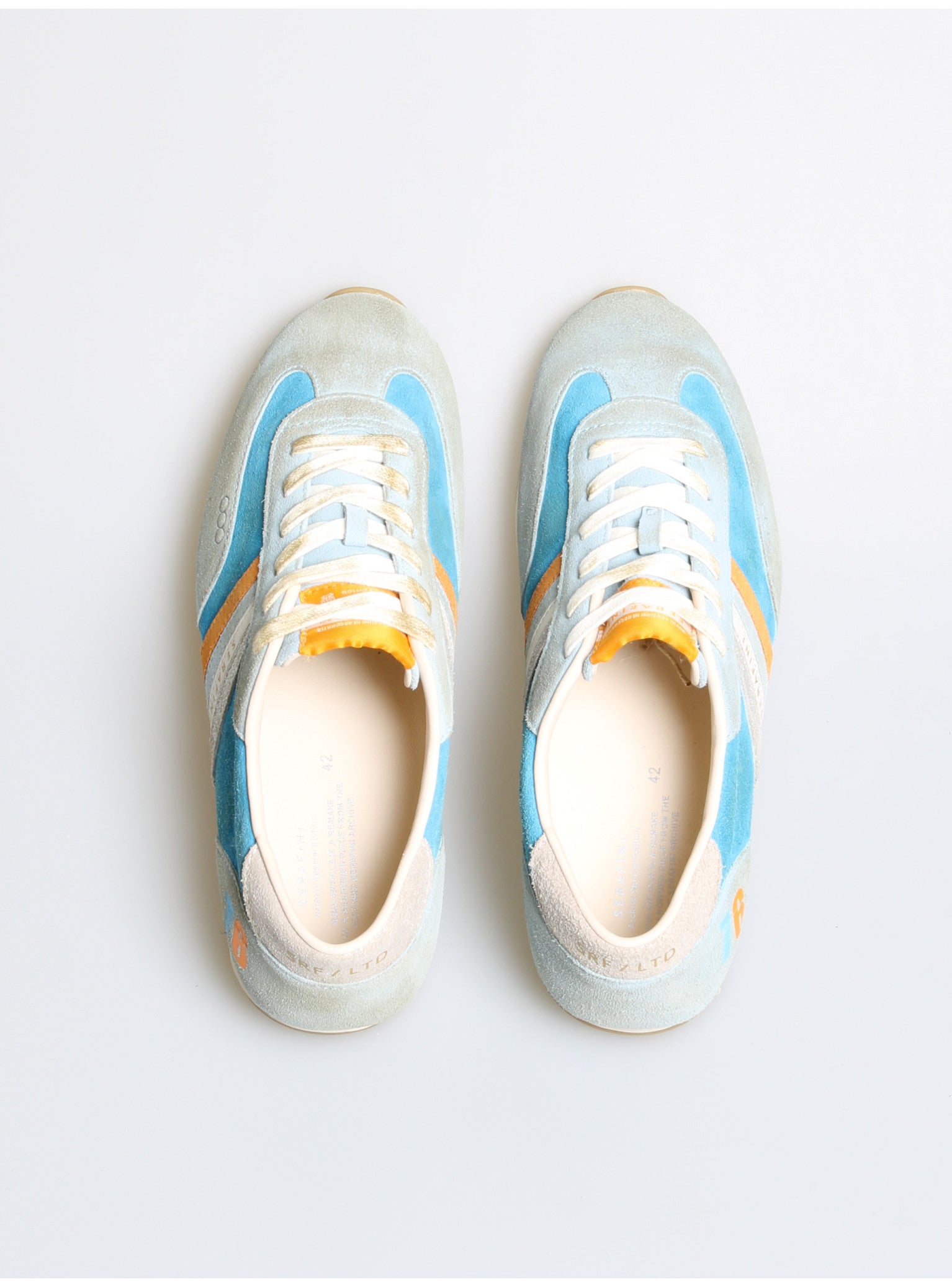 Un incontro tra freschezza mediterranea e dinamismo nipponico. La RM60 Blue Flame Japan si distingue per la sua tomaia in pregiato camoscio azzurro cielo, una tonalità luminosa che evoca la libertà dell'estate, arricchita da inserti in suede grigio perla sulla punta e sul tallone.