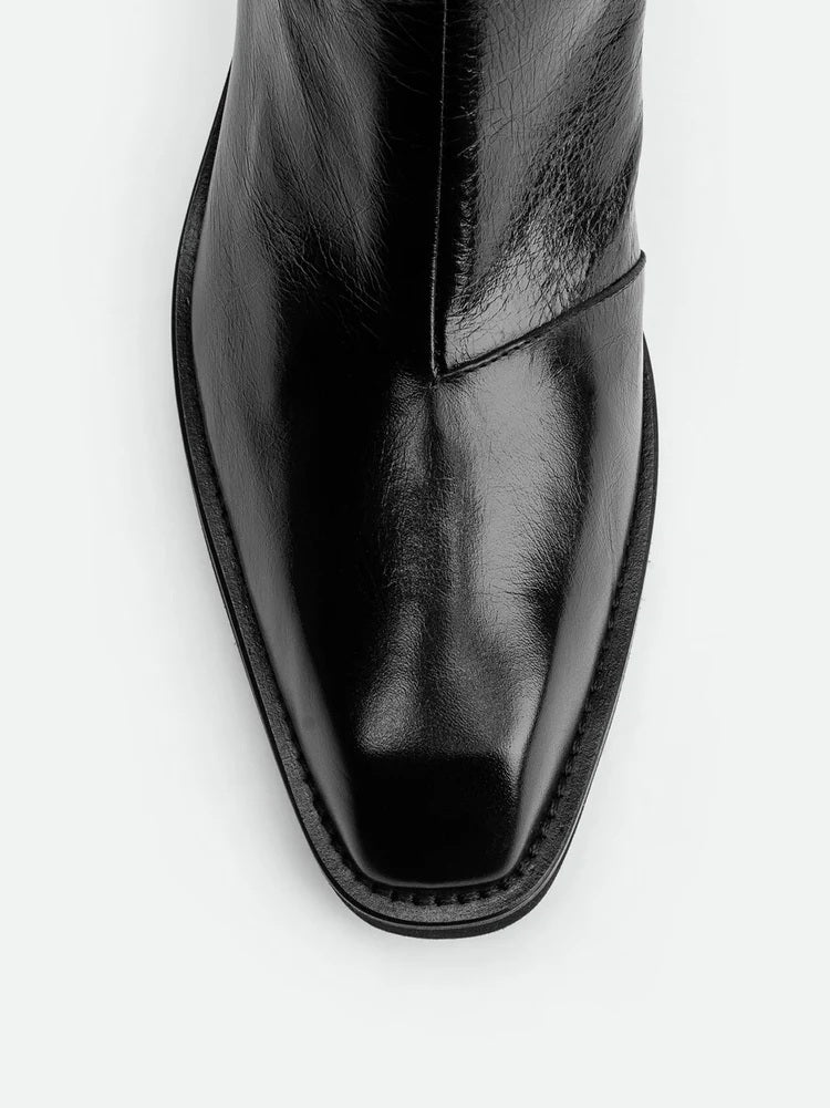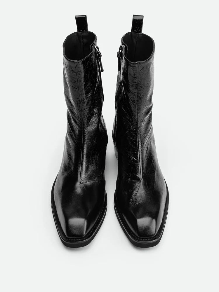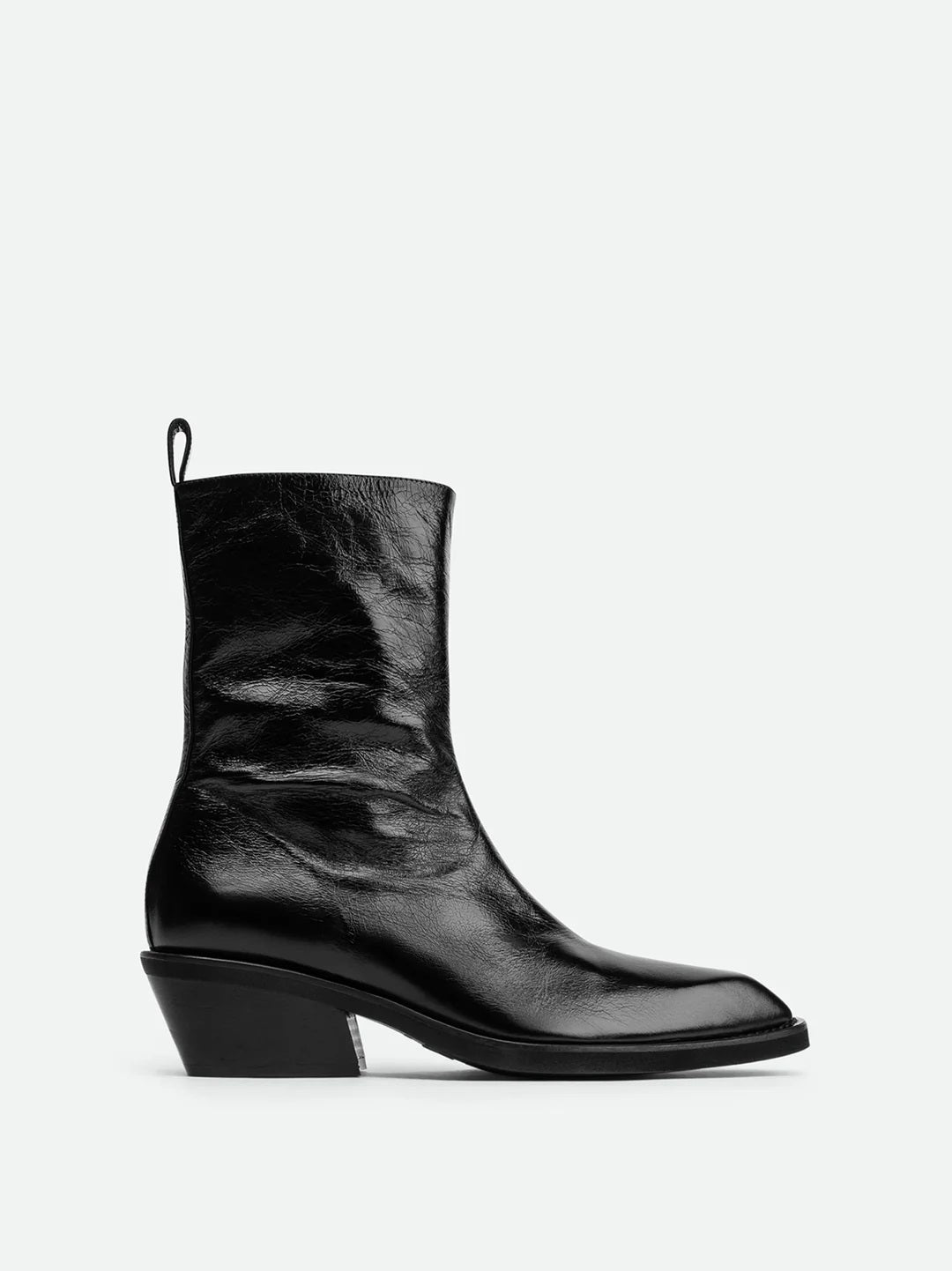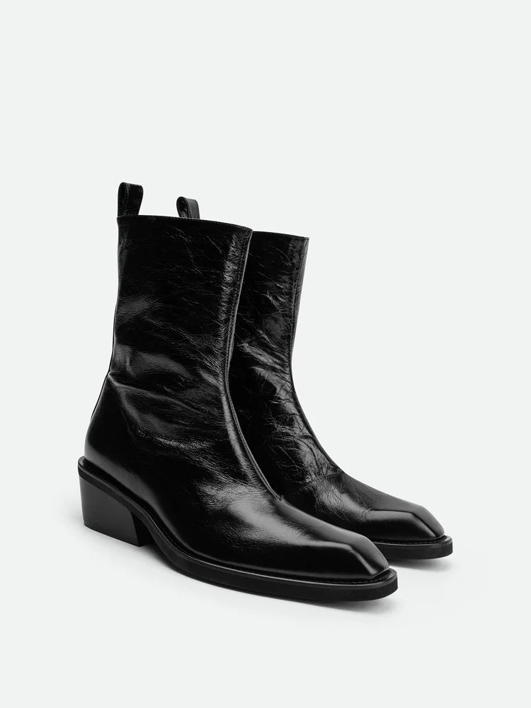 Gli stivaletti bassi sono realizzati a mano in Italia in morbida pelle nera lucida, leggermente stropicciata. Caratterizzati da una forma allungata, una vistosa punta a griffe e un tacco cubano angolato, conferiscono un carattere deciso a una silhouette elegante. Nota sulla vestibilità: questo modello veste leggermente grande. Se sei tra due taglie, ti consigliamo di scegliere la più piccola.
