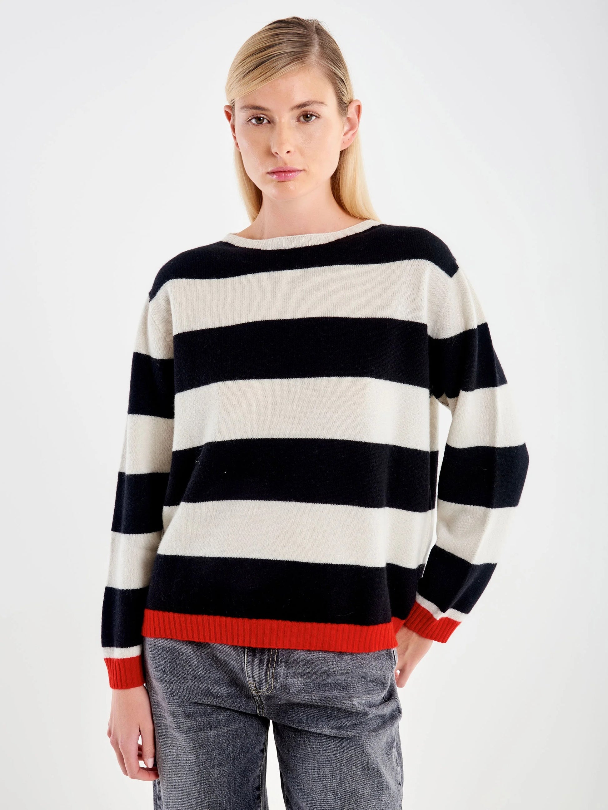 Pull girocollo a righe maniche lunghe. Dettaglio fondi a contrasto in maglia a costine.