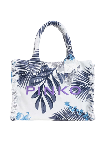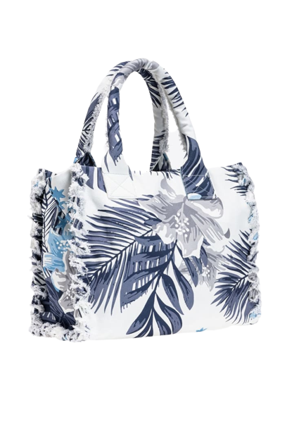 Borsa shopper Beach di forma squadrata in canvas di cotone riciclato e stampato con soggetti estivi. Logo ricamato e infilature laterali dall'effetto sfrangiato. Foderata in leggero tessuto di cotone riciclato. Doppio manico top handle.