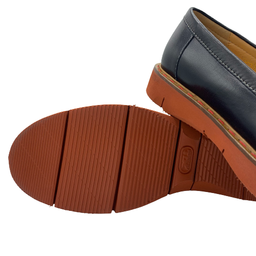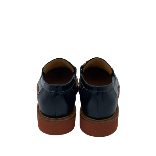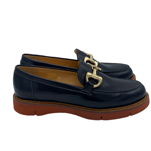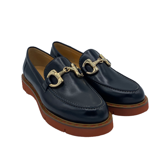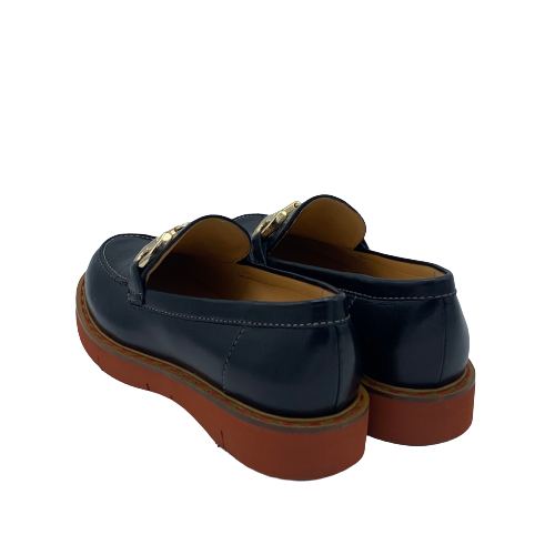 Mocassino Viola Ricci in pelle blu con morsetto in metallo color oro e cuciture a contrasto