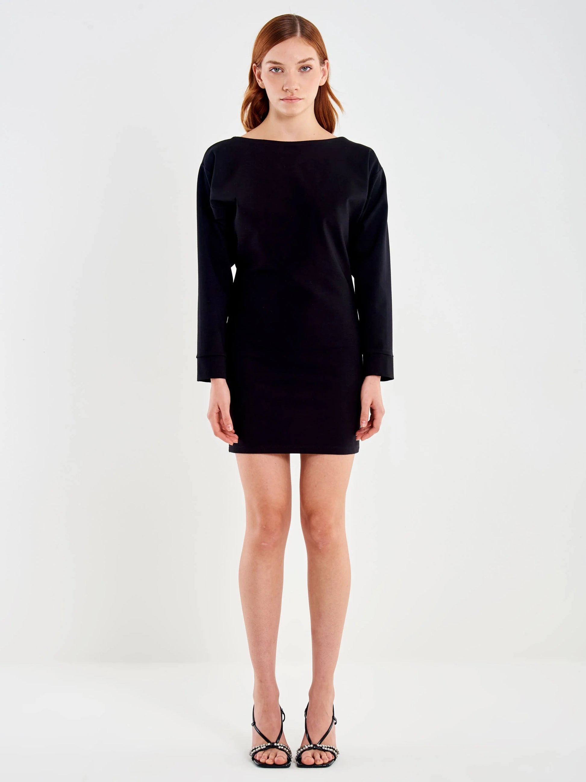 Abito corto maniche lunghe con retro drappeggiato. Dettaglio laccio con fiocchetto sul retro.