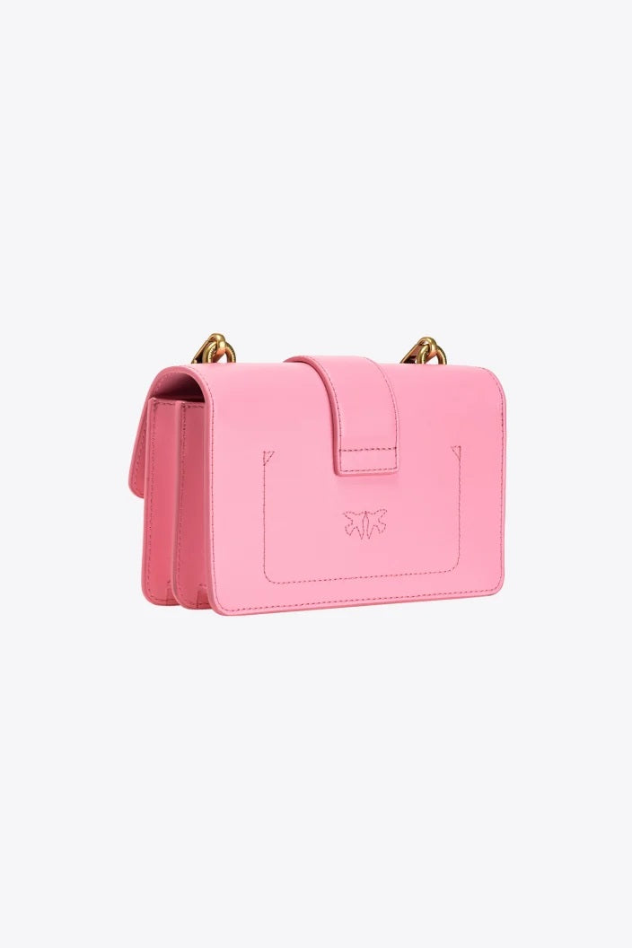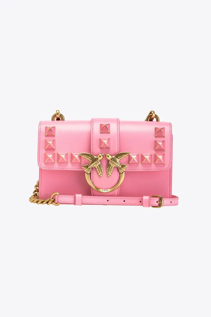 Mini Love Bag One in morbida pelle mano seta impreziosita con borchie squadrate, smaltate in tono colore sulla patta e sul baccello. La chiusura è completata dall'iconica fibbia in metallo Love Birds Diamond Cut. L'interno è foderato in microfibra scamosciata e comprende tramezza chiusa con zip e tasca a parete in pelle. La tracolla combina la classica catena metallica rotonda al pratico spallaccio regolabile in pelle.