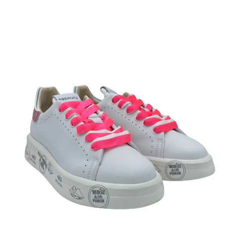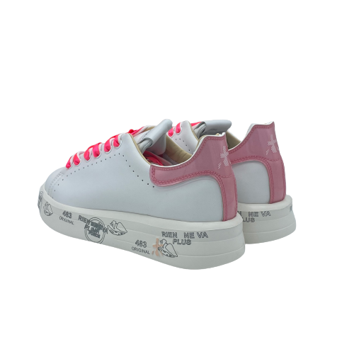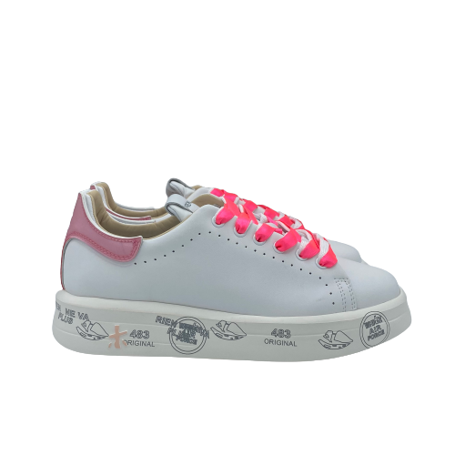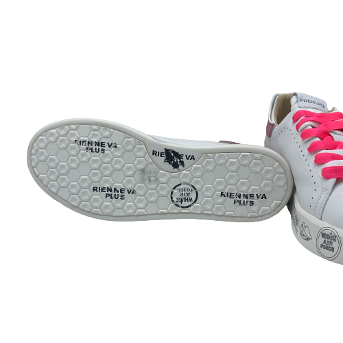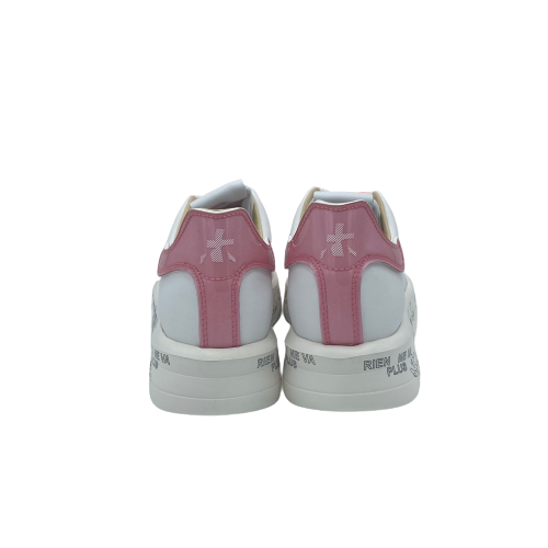 Sneakers allacciate in pelle bianca con punta arrotondata e dettaglio in pelle decorata con cristalli tono su tono. Logo Premiata sulla linguetta e suola oversize in gomma caratterizzata dai leggendari timbri che rinforzano l'unicità del Brand.
