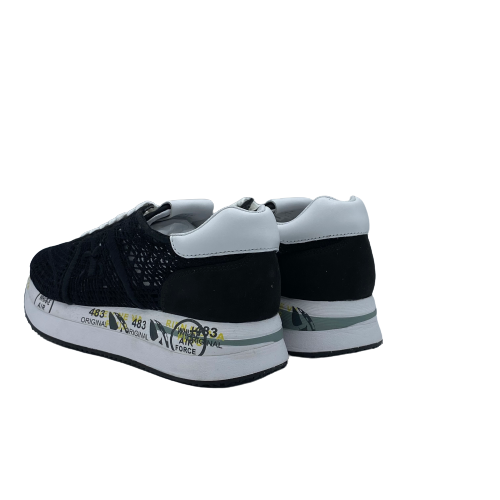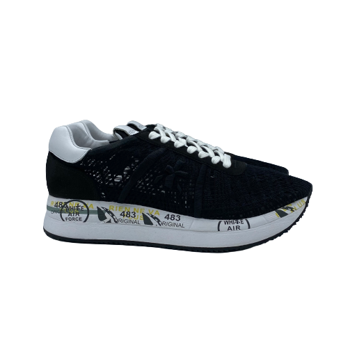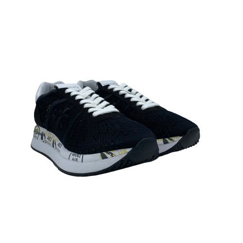 Sneakers Conny nella tonalità del nero con tomaia ricamata con una mano stile uncinetto e dagli immancabili dettagli in pelle. Dallo spirito casual glam, il fondo valorizza il look slanciando la silhouette.