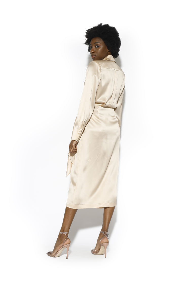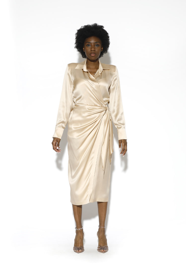 Un delicato gioco di drappeggi e sovrapposizioni anima la silhouette di questo wrap dress in satin di seta. Questo capo si distingue per la sua eleganza e raffinatezza, caratterizzato da uno scollo a V che richiama la classicità di una camicia. Un fiocco da annodare sul fianco sinistro e un elegante drappeggio creato da un fermo laterale in vita conferiscono all’abito una nota inedita e sofisticata.