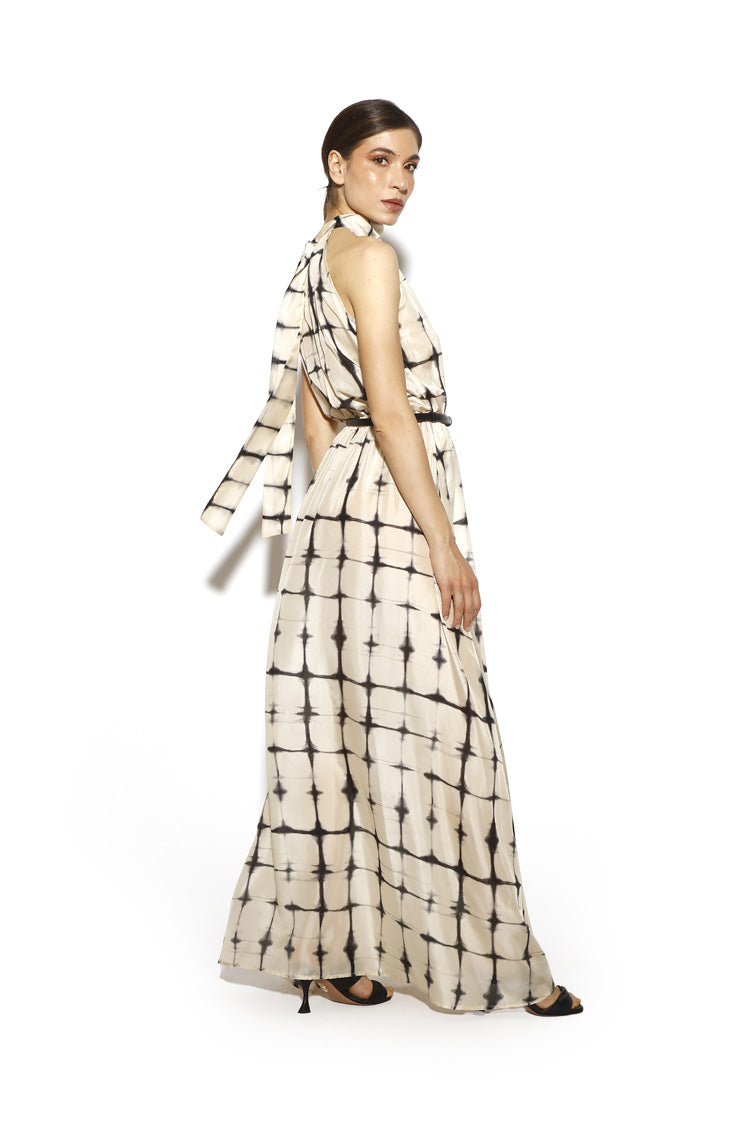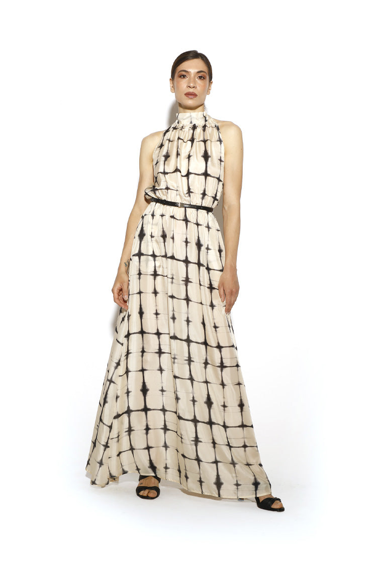 Elegante abito smanicato in seta habutai con corpetto morbido e scollo all’americana con nastro. Il tessuto leggero dona una vestibilità morbida, mentre l’elastico in vita e delle comode tasche regalano essenzialità e praticità.
