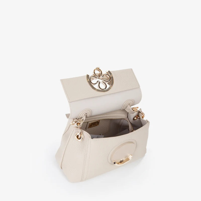Mini cartella in grana sfoderata con chiusura fiorone V°73. Tracolla personalizzata in nastro.