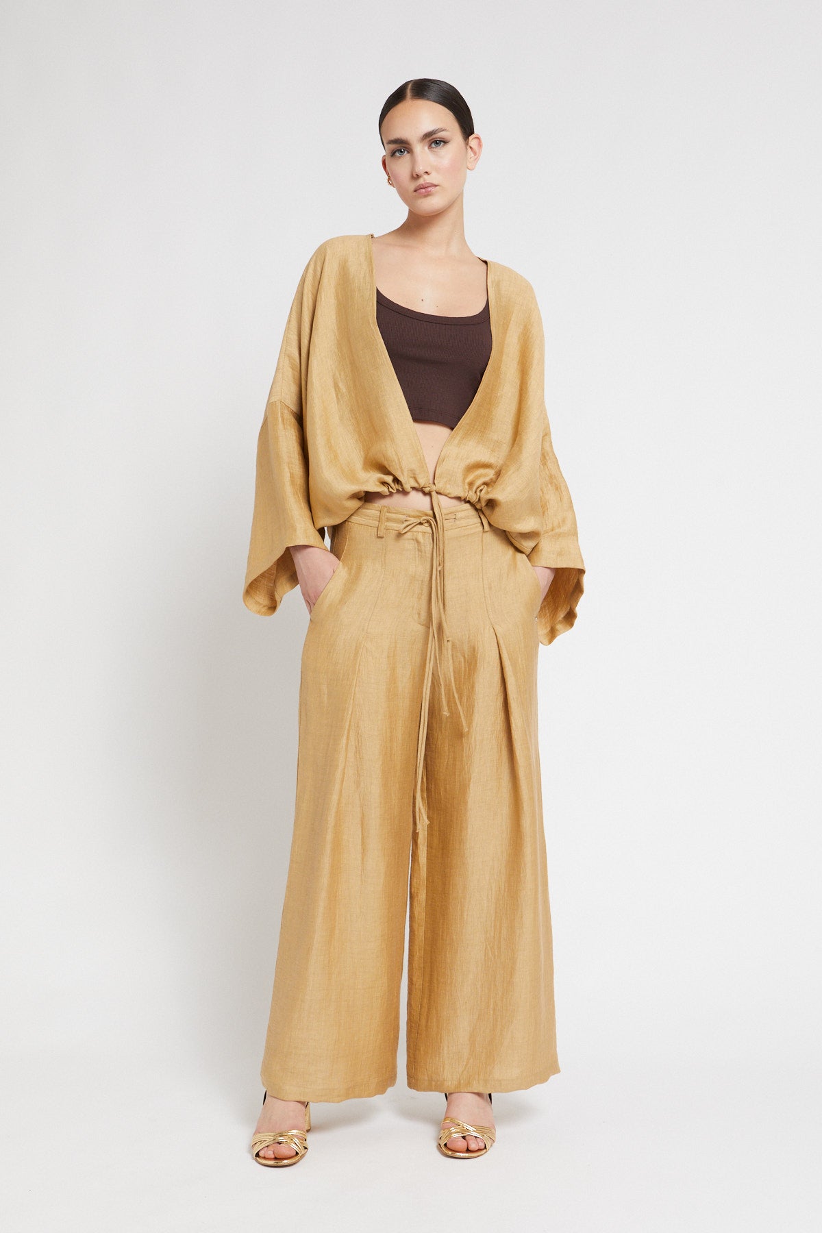 Cardigan in lino satinatocon coulisse al fondo e manica ampia.