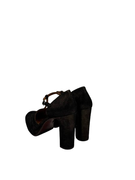 Decollette Yaisu 47, in colore Bronze con tacco 10 cm e palteau 3cm , effetto laminato con chiusura cinturino .