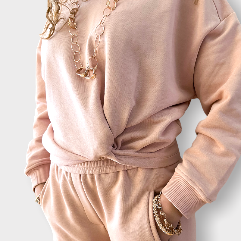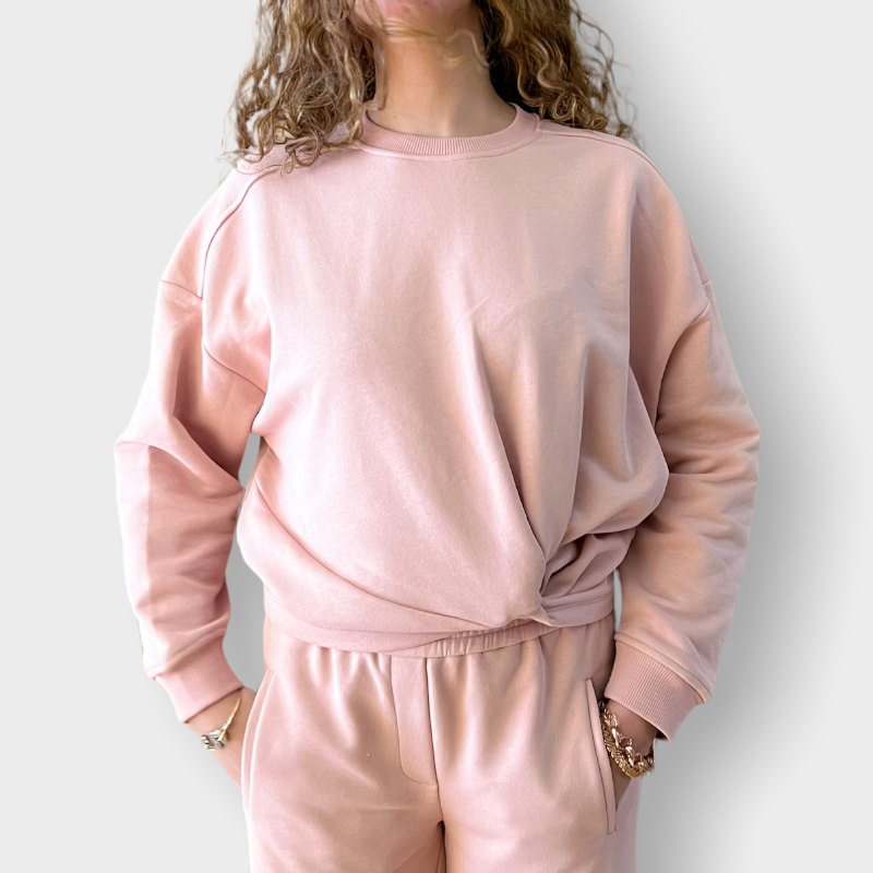 Felpa corta a girocollo a maniche lunghe, dettaglio di cuciture sul davanti e nodo