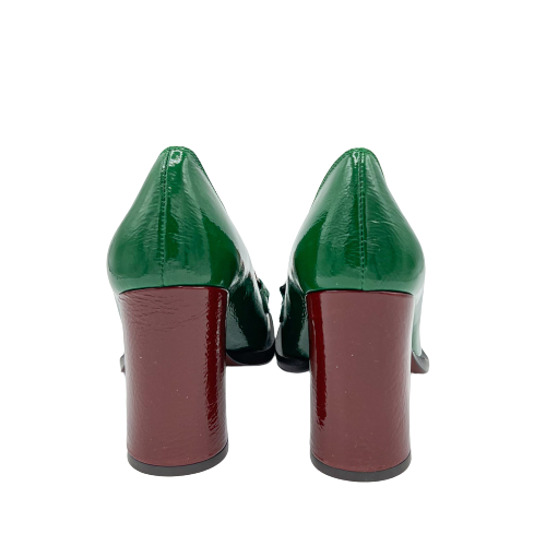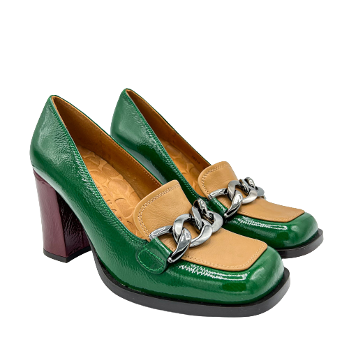 Mocassino con tacco Chie Mihara con un mix di pelli verde, bordeaux e color biscotto