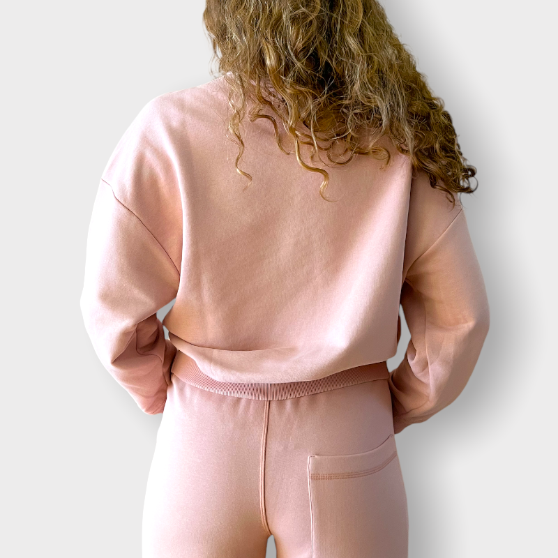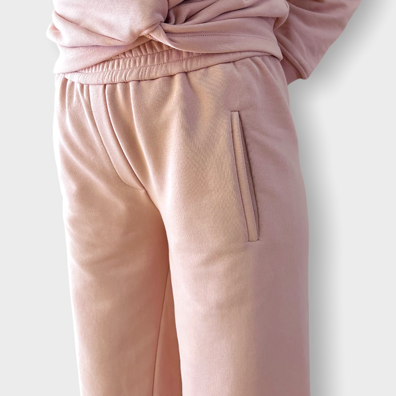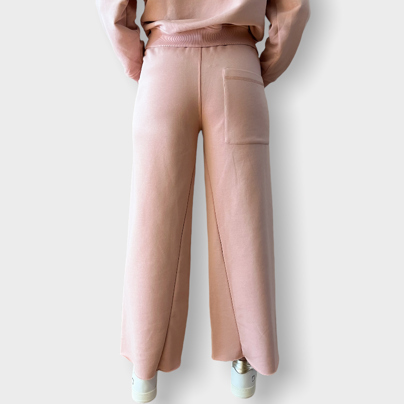 Pantaloni in felpa con elastico in vita, taglio a vivo nel fondo, tagli nell’interno gamba, due tasche laterali, una tasca posteriore lunghezza alla caviglia,