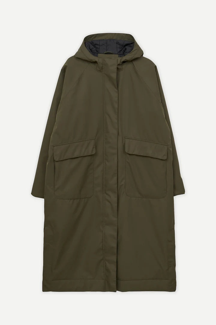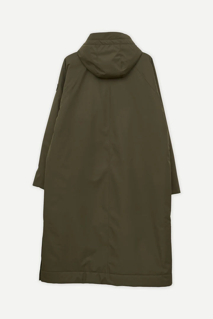 Variante : KAKI Cerniera in nylon a doppio cursore e chiusure magnetiche sulla patta antivento. Tasche applicate con patta e aperture laterali con cerniere impermeabili. Patte antivento con chiusure magnetiche. Cappuccio regolabile con coulisse, visiera integrata e collo alto. Maniche raglan. Spacchetti laterali con bottoni automatici. Polsini antivento. Vestibilità oversize in stile mantella.