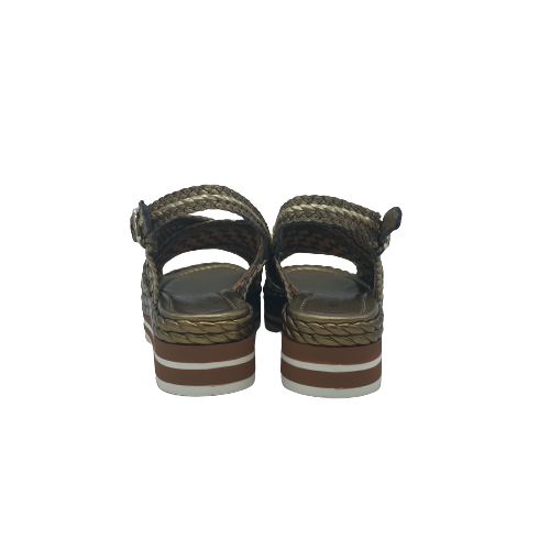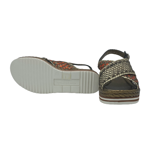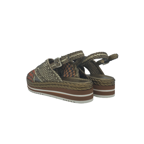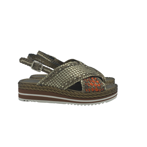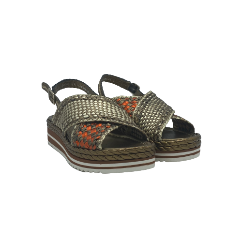 Sandalo Pons Quintana incrociato in pelle intrecciata color bronzo, platino e arancio