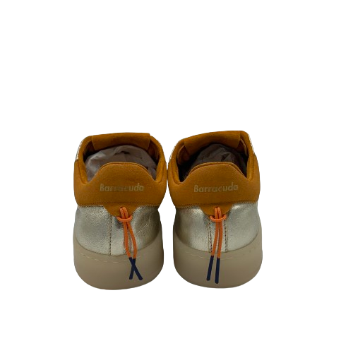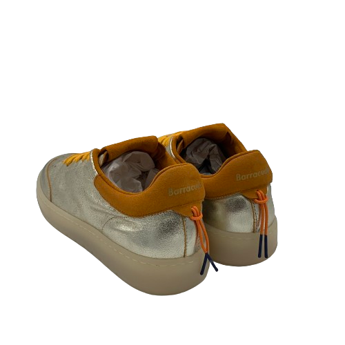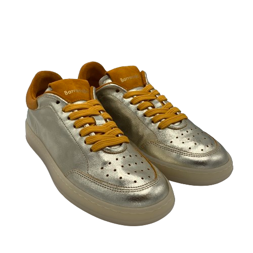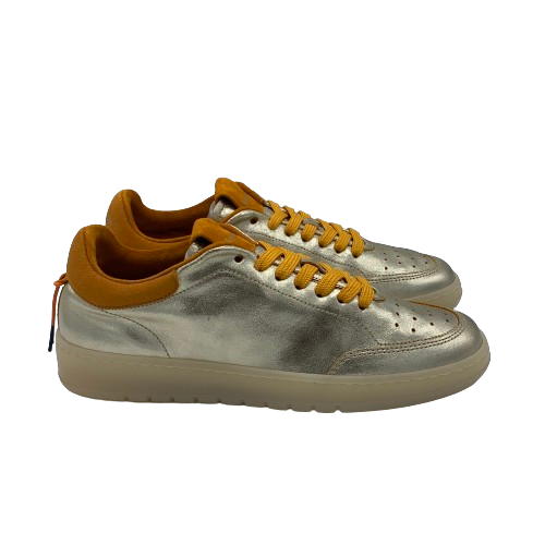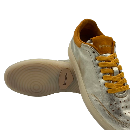 Sneakers Barracuda in pelle laminata color platino con inserti in camoscio color arancio