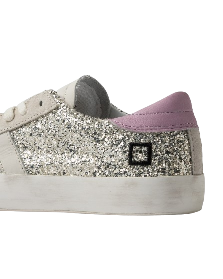 Sneakers bassa in glitter platino e pelle beige.