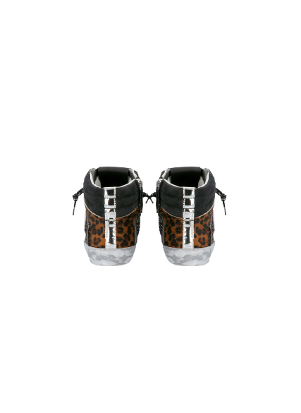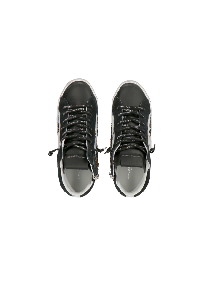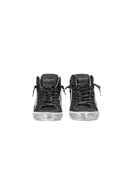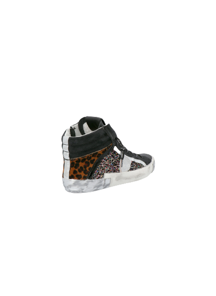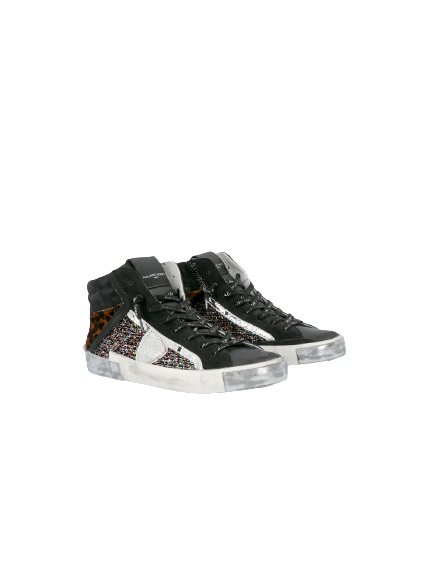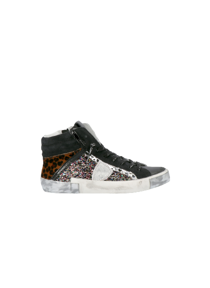 Il concetto di vissuto come sinonimo di artigianalità trova nella sneaker PRSX la sua espressione massima, grazie alla particolare fasciatura della suola, volutamente imperfetta e per questo brevettata dal marchio. Il modello high-top PRSX donna è in pelle di vitello con inserti in tessuto floccato lamè, dettagli in cavallino, pelle effetto metal e suede unisce un'attitudine casual ad una ricercatezza unica di materiali. La suola in gomma è arricchita da dettagli in tessuto effetto specchio.