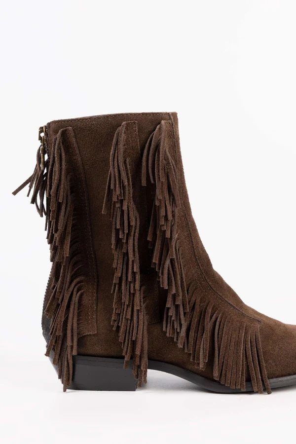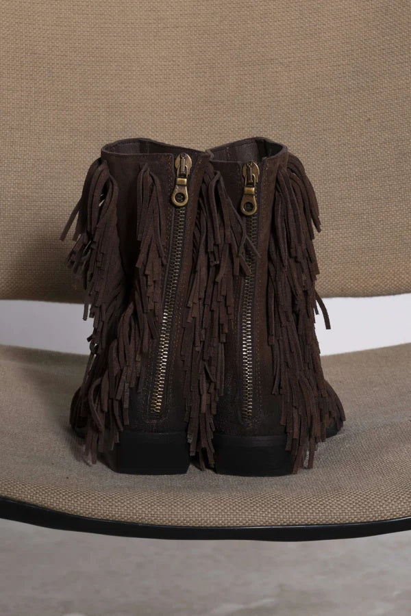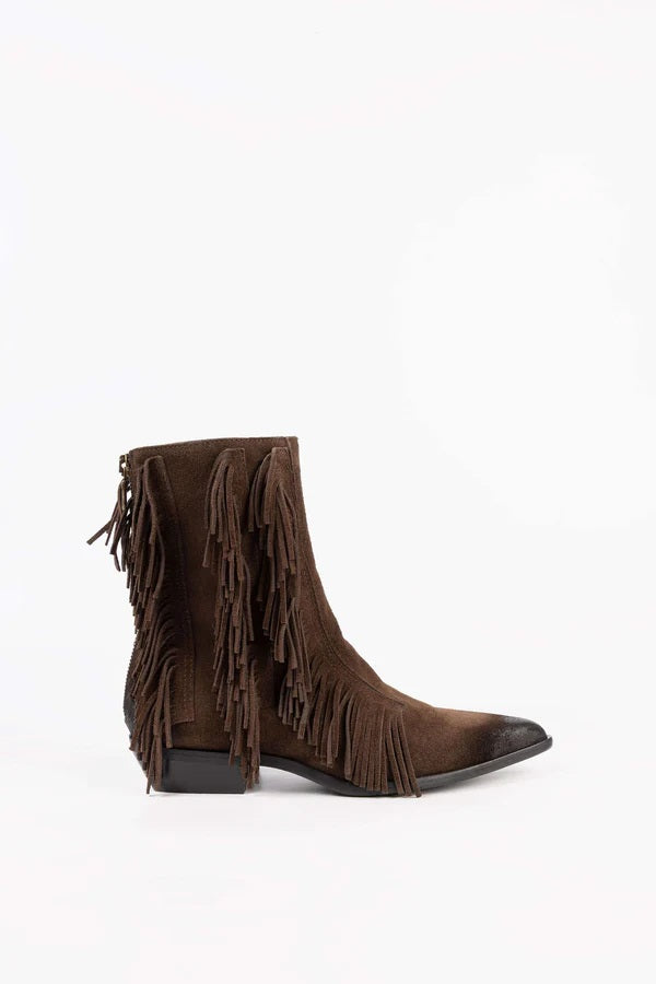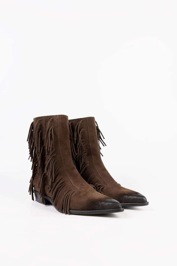 Il dettaglio delle frange laterali richiama l’anima western e conferisce movimento e carattere al design, mentre il tacco di 3 cm e la suola in tunit offrono stabilità e resistenza, ideali per un utilizzo quotidiano. La tonalità marrone esalta la naturalezza del materiale, rendendo questo modello versatile e facilmente abbinabile.
